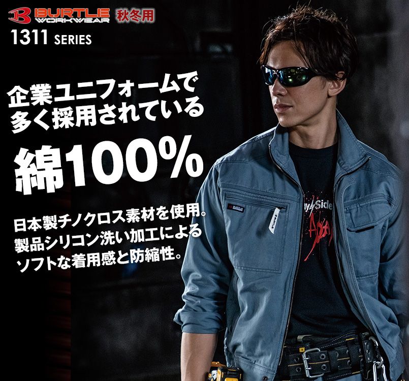 バートル1311は、高品質な日本製チノクロス素材を使用したオールシーズン向け作業着。製品シリコン洗い加工によるソフトな着用感と防縮性。衿廻りに蓄熱保温素材を採用。防縮加工、火に強い綿素材。