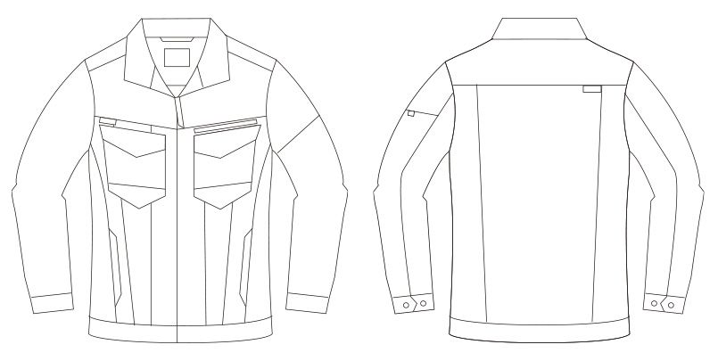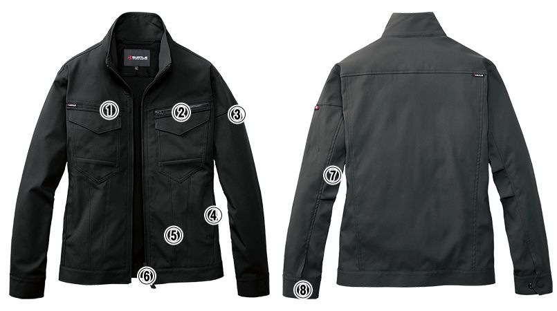 仕様 | 胸ペン差し(右)、ダブルジップ仕様、袖ペンポケット(左)、レベルブック・トランシーバー・収納ファスナーポケット(左)、両脇ポケット、袖アームタック、カフスドットアジャスター、内ポケット(左・ドットボタン止め) |