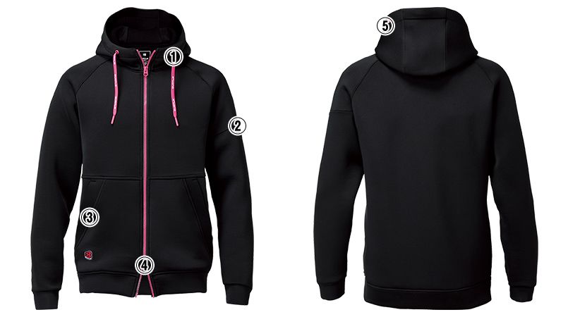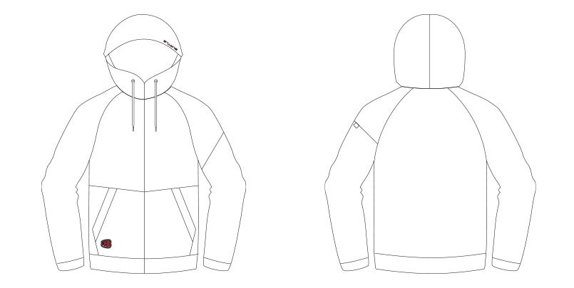 仕様 | フードドローコード、フードプリント、袖ペンポケット(左)、ダブルジップ仕様、両脇ポケット |
