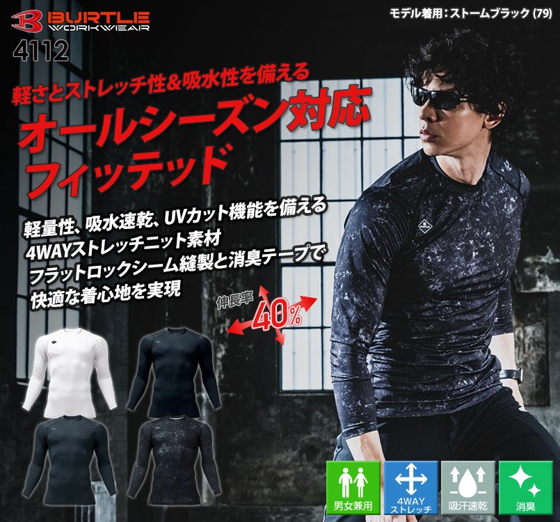 仕様 | 脇消臭テープ仕様、通気メッシュ、フラットロックシーム縫製 |