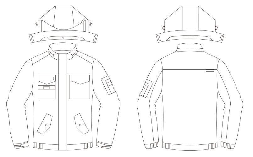 仕様 | フードプリント、大型フードスピンドル付き(ボタン止め脱着仕様)、フード脱着、レベルブック・iPhone収納ファスナーポケット(左)胸ペン差し(左)、袖ポケット(左)、内ポケット(左)、フラップ付き両脇ウォームポケット、カフスアジャスター、水抜きメッシュ(ウォッシャブル機能)、撥水加工 |