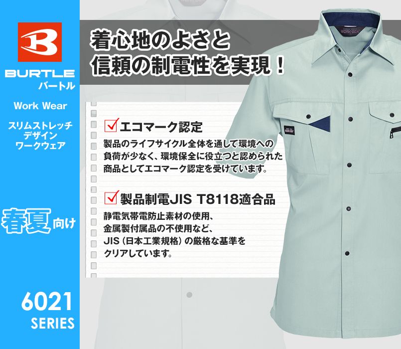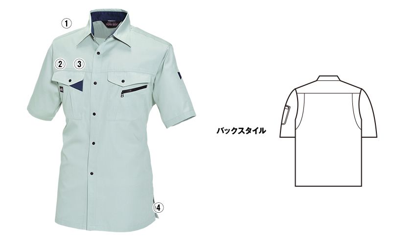 エコマーク認定の作業用シャツ。耐久性とソフトな着用感が特徴です。品番:11-6023の長袖シャツが同じデザインの長袖タイプになります。