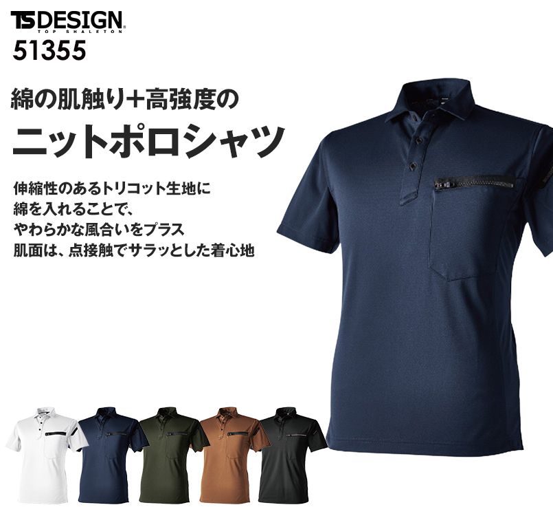 TS DESIGN 51355は綿の肌触り+高強度のニットショートポロシャツ。伸縮性のあるトリコット生地に綿を入れることで、やわらなか風合いをプラス。ニット特有の伸縮性に富みながら、布帛のような形態安定性も。肌面は、点接触でサラッとした着心地。吸汗速乾、帯電防止素材、消臭テープ仕様と機能面も充実。