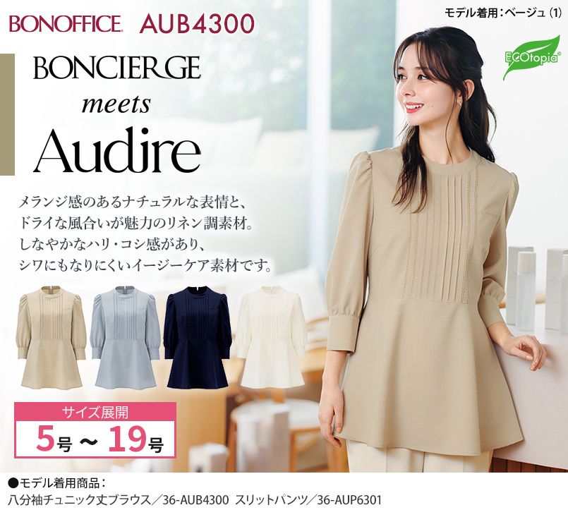 BONMAX AUB4300 [通年]BONCIERGE meets Audire 八分袖チュニック丈ブラウス[吸水速乾/ストレッチ]