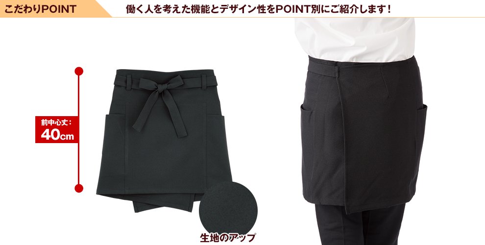 私は小柄ですが肩や首が凝る為に腰に巻くエプロンをしています。商売柄、屈むことや下を向く事もあり、お尻や腰をスッポリ巻くエプロンは少ないですね。探すのにとても苦労しています。毎日変えるので、枚数もほしいですし。黒以外はだめですし。洗濯を毎日するのでもう少ししっかりした生地がほしいです。ループ付きも中々ないですが、これは付いていたので選びました