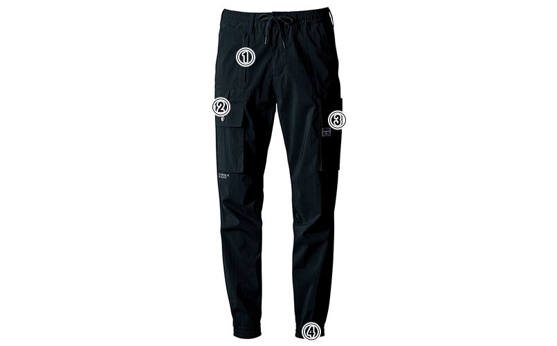 | 仕様 | 右側ファスナー付きポケット、2重構造の右カーゴポケット、マチ付きで大型の左カーゴポケット、計9個のポケットを搭載、裾ゴム仕様、国産YKK社製を使用したタック釦 |