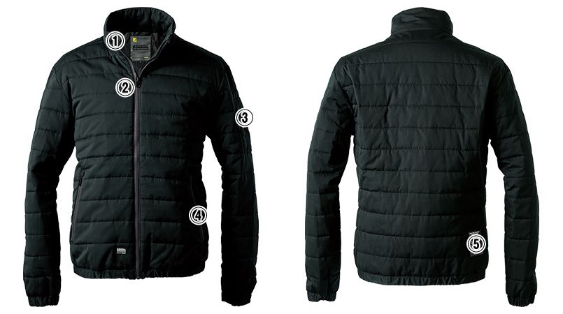 | 仕様 | チンガード付きの襟元、右胸ファスナー付き内ポケット、ペン差しポケット、ファスナー付き両脇ポケット、シンプルな横キルトステッチ(color:05,51)、カジュアルなダイヤキルトステッチ(color:88,89)、超音波圧着(ピンソニック)方式(color:90)、合皮ワッペン、ワンポイントピス、オリジナルファスナー、ドット釦 |