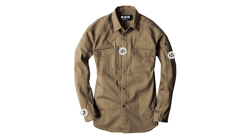 | 仕様 | 伸縮素材/洗い加工/右胸ファスナーポケット/左袖ペン差し/ヒジ立体カッティング/袖口カフスアジャスター付き/樹脂ファスナー/金属ボタン(ドットボタン) |