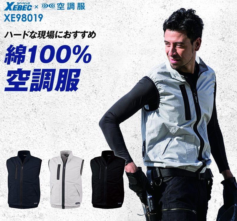 ジーベックXE98019の空調服ベスト。ハードな現場にピッタリな綿100%タイプ。綿の良さは吸湿性と肌触り、そして着るごとに馴染んでくる風合い。ツヤ消しの金属ファスナーでよりハードな印象に。