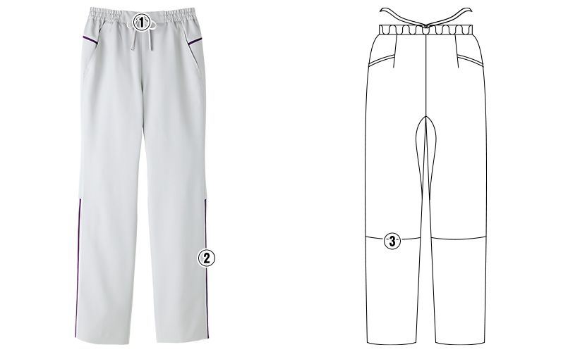 | 仕様 | 両脇ポケット、ウエストひも仕様、サイドパイピング、膝裏カッティング、ノータック、総ゴム、SEK制菌加工、制電、ストレッチ |