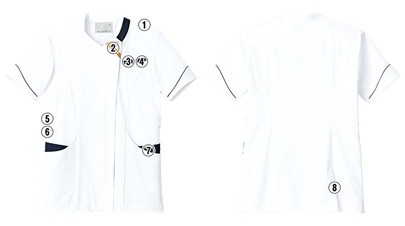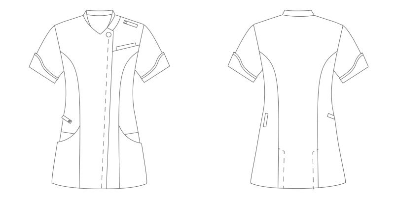 | 仕様 | 左肩ループ付き、日勤・夜勤がひと目で分かる機能仕様、PHS専用ポケット、インク染み防止ポケット、左右ウエストループ付き、角度付きループ、内ポケット付き、サイドベンツ入り、SEK制菌加工、制電、ストレッチ、透け防止(白のみ) |