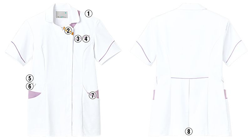| 仕様 | 左肩ループ付き、日勤・夜勤がひと目で分かる機能仕様、PHS専用ポケット、インク染み防止ポケット、左右ウエストループ付き、角度付きループ、内ポケット付き、バックプリーツ、SEK制菌加工、制電、ストレッチ、透け防止(白のみ) |