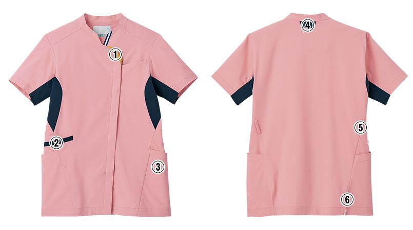 | 仕様 | 日勤・夜勤がひと目で分かる機能仕様、ウエストループ、右脇小物ポケット、左腰内ポケット、サイドベンツ入り、SEK制菌加工、吸汗速乾、制電、ストレッチ |