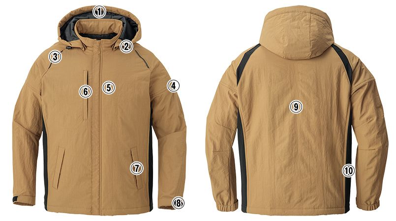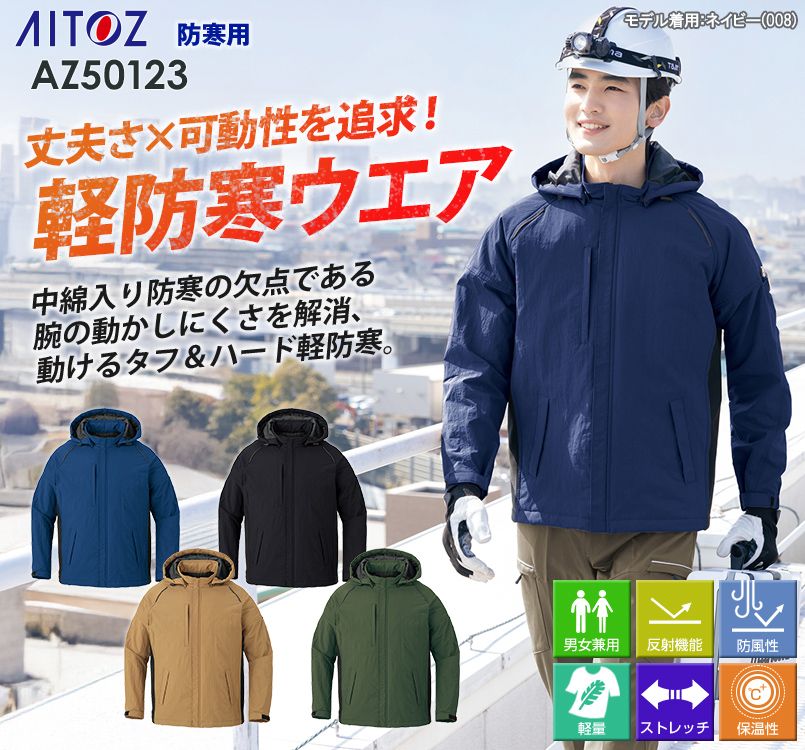 取り外し式フードで寒い作業時も安心。ドット釦で簡単に着脱が可能。