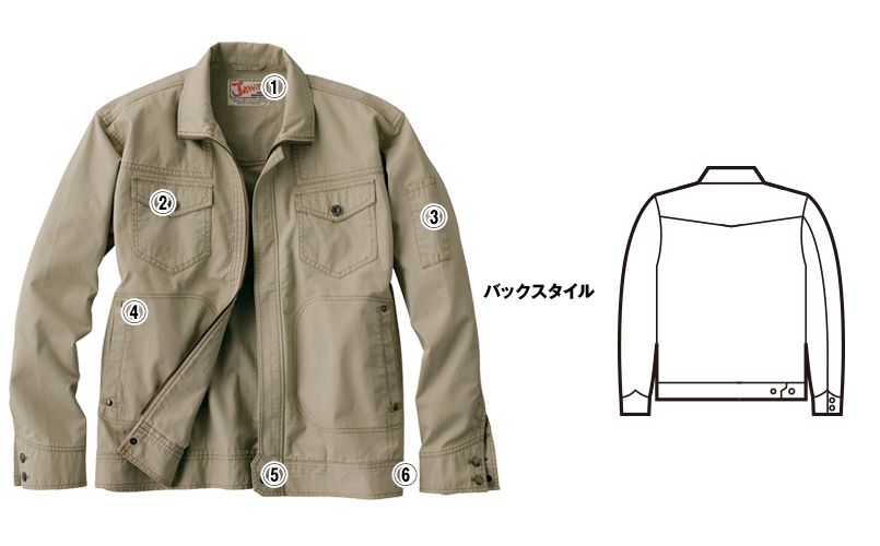 自重堂JAWIN 55000の長袖ジャンパーは、ジャウィンのオーソドックスなスタイルをキープしたワークウェアです。綿素材のピケを使用し、バイオウォッシュによりワイルドな風合いを出しています。腕のペン差しや、両胸両横などポケットも多く収納力も万全です。両横ポケット口には補強も兼ねたオリジナルデザインリベットが施され、ステッチもダブルでおしゃれです。