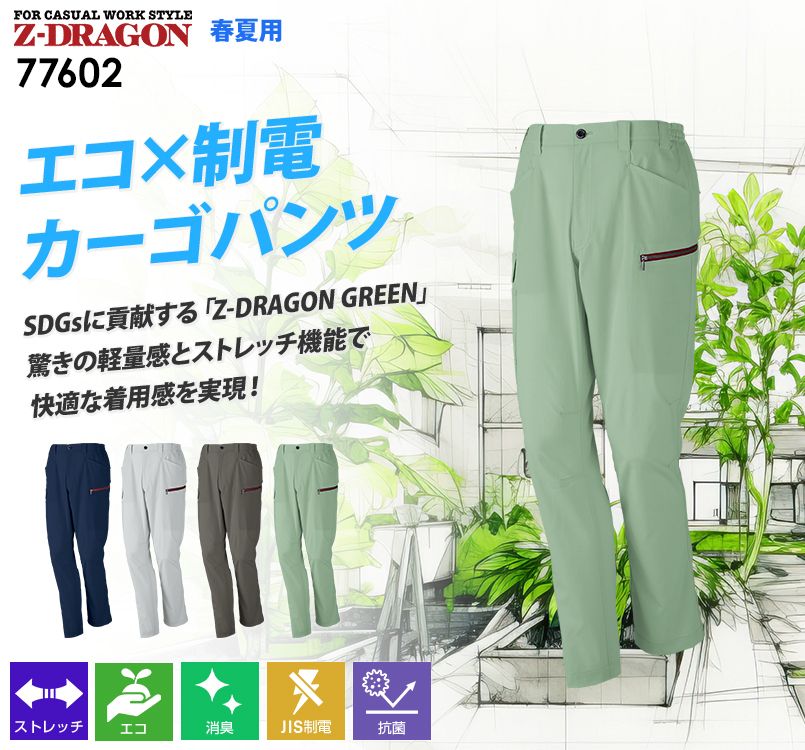 自重堂 77602 [春夏用]Z-DRAGON GREEN エコ製品制電ストレッチノータックカーゴパンツ[男性用]