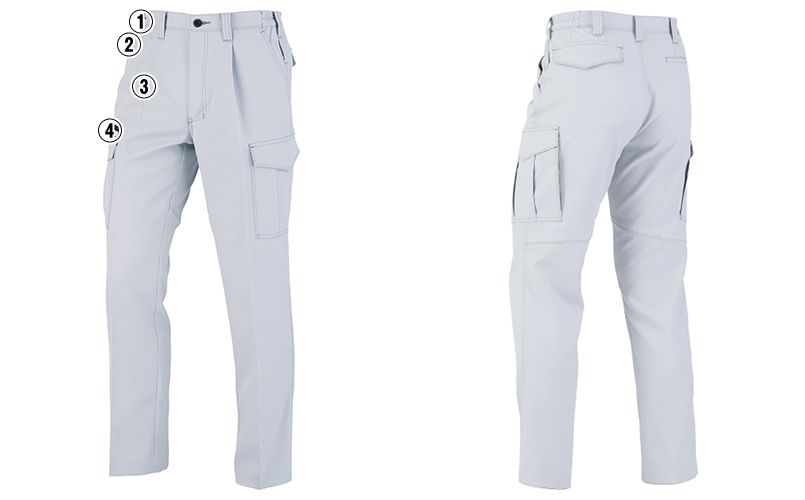 | 仕様 | 脇ゴム仕様、両脇カラビナループ付、マルチポケット、右脇ポケット内側コインポケット、ボタン・カーゴポケットファスナー樹脂製、前立ファスナー金属製、JIS T8118適合、帯電防止、ワンタック |
