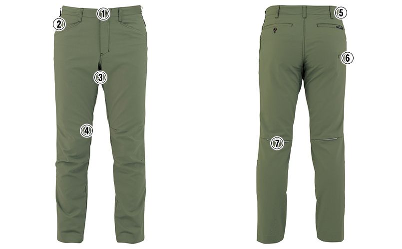 | 仕様 | フロント持ち出し仕様、両脇カラビナループ付、両脇コインポケット付、クライミングカット、ひざタック仕様、ヴィンテージタイプの腰廻り、マルチポケット、ひざ裏反射パイピング付、ボタン樹脂製、ファスナー金属製、JIS T8118適合、帯電防止、ストレッチ、ノータック |