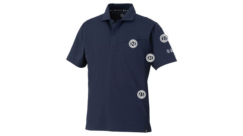 | 仕様 | 左胸スリットインポケット、左袖ペン差し、汗ジミ防止(汗取りパッド付き)、Xラインシルエット(SS~LLまで)、転写プリント(ボトルテック・カーボンオフセット・エコマーク)、エコ素材、ニオイクリア®EX、鬼鹿の子、UVカット |