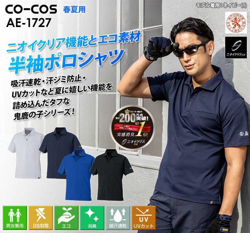 ![コーコス AE-1727 [春夏用]ニオイクリア エコ制電鬼鹿の子半袖ポロシャツ Xラインシルエット(SS~LLまで)