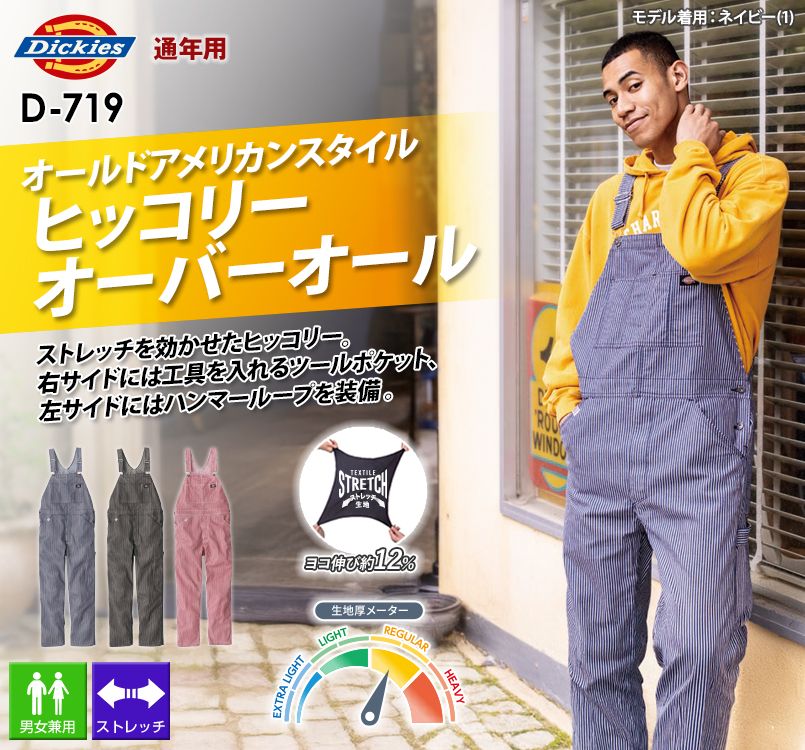 コーコス D-719 [通年]Dickies ストレッチヒッコリー オーバーオール つなぎ[男女兼用]