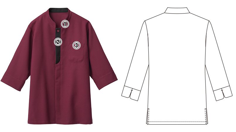 | 仕様 | 前立て、比翼ボタン、左胸ポケット、ペン差しポケット、七分袖、HACCP支援、高通気、防脱色 |