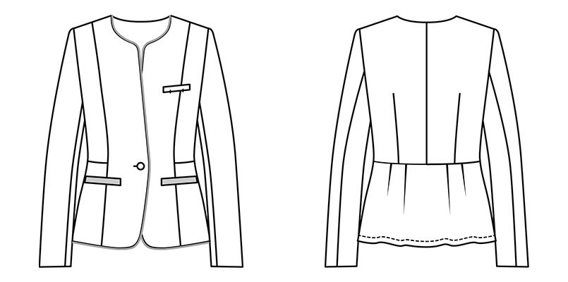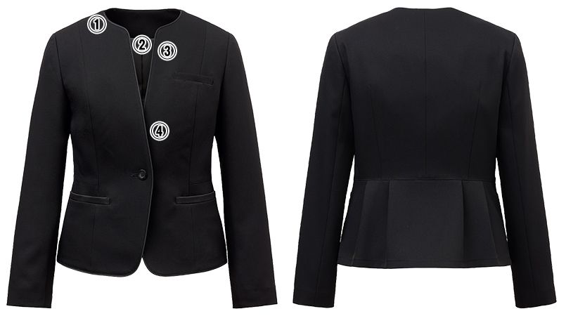 | 仕様 | タック入りペプラムデザイン、肩パッドなし、右襟見返しアクセサリー用ホルダー、ネームホルダー、内側インカムループ、裏地背抜き仕立て、左胸内ポケット、ホームクリーニング(家庭洗濯)、制電糸入り |
