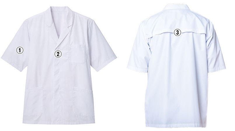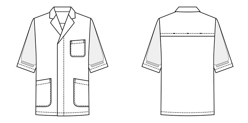 | 仕様 | 前身スナップボタン留め、袖体毛落下防止ネット、背中ベンチレーション、左胸・両腰ポケット、五分袖、制電、HACCP支援 |