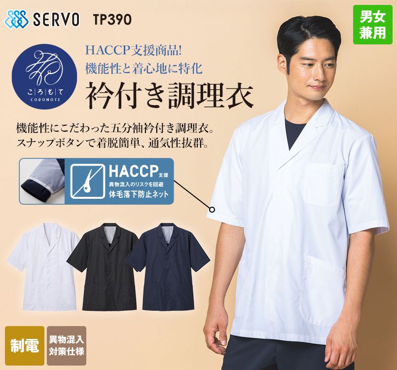 ![SerVo(サーヴォ) TP390 調理衣/五分袖/衿付き[ころもて][男女兼用] 体毛落下防止ネット。