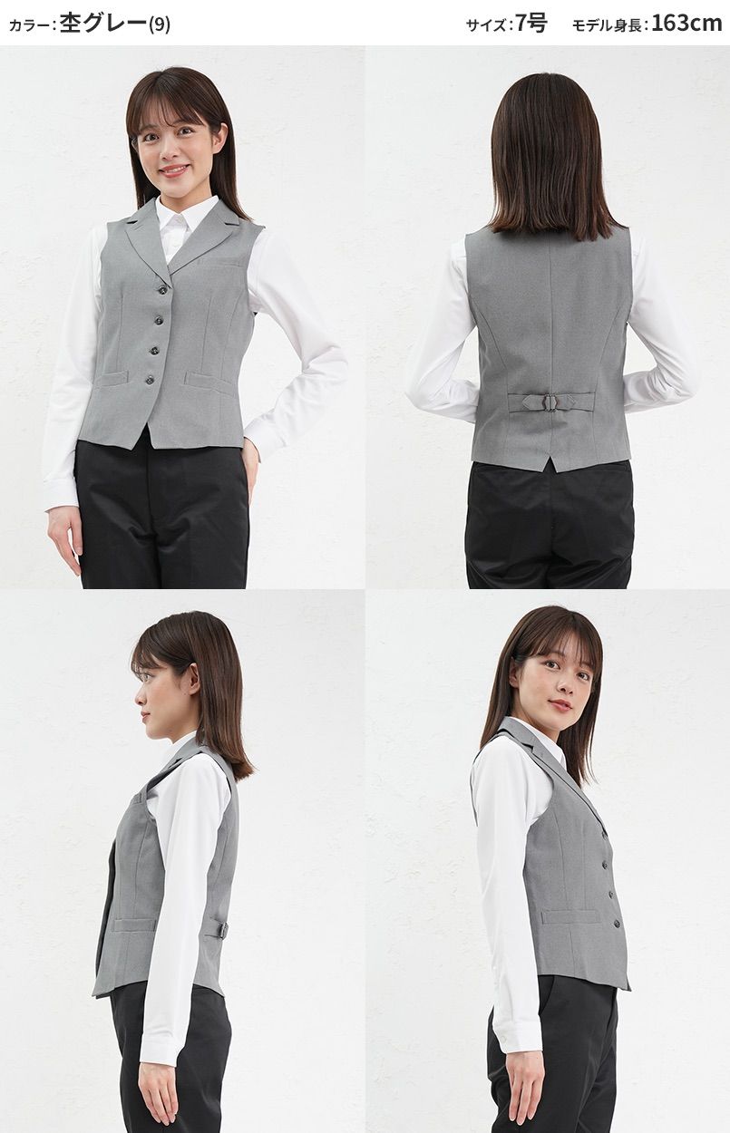 毎日着用されることを考えた撥水、防汚機能付きの女性用ベスト。オシャレなグレー色で、正面は4つボタン。襟ぐりにおさえステッチを施し、洗濯時に裏地が出ないように配慮しました。背面には背ベルト付きで高級感を演出できます。