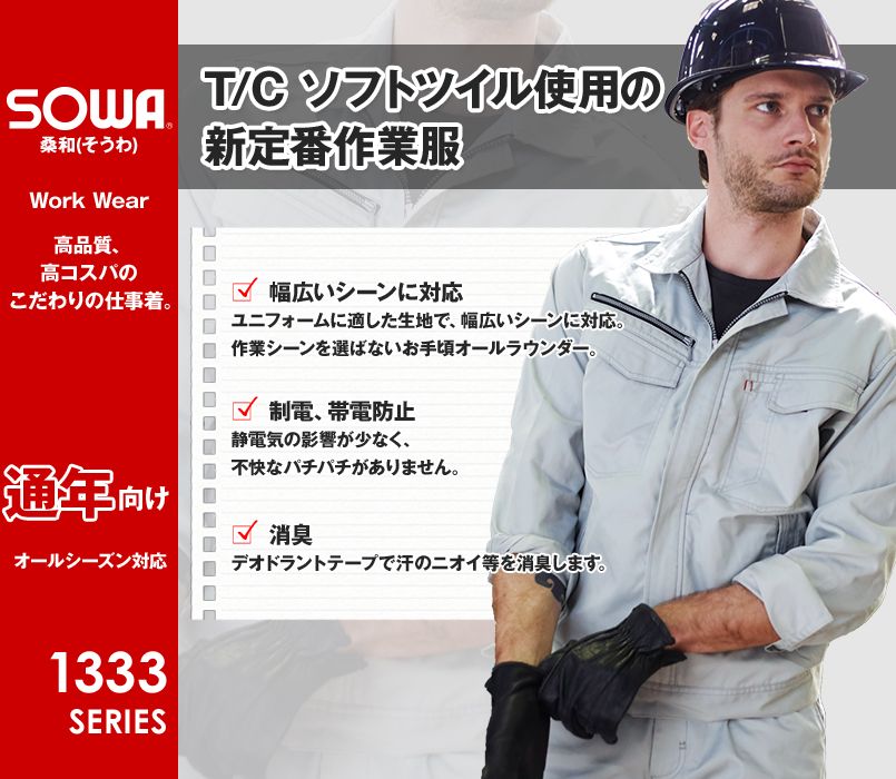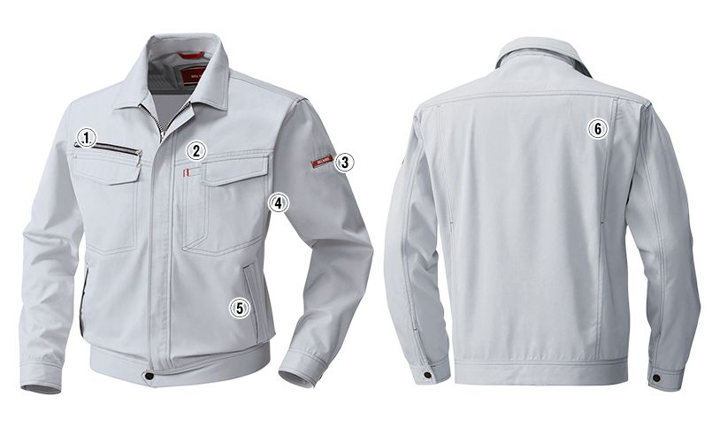 桑和1333の長袖ブルゾンは、ワークウェアとは思えないオシャレ度満点の一着です。肌触りの良い綿素材で、起毛加工がされています。綿ならではの優れた吸汗性で、快適に作業をしていただけます。3か所のペン差しと両胸両横のポケットに加え、右横にはファスナーポケットも付いていて収納力も申し分がありません。