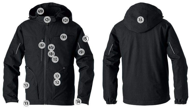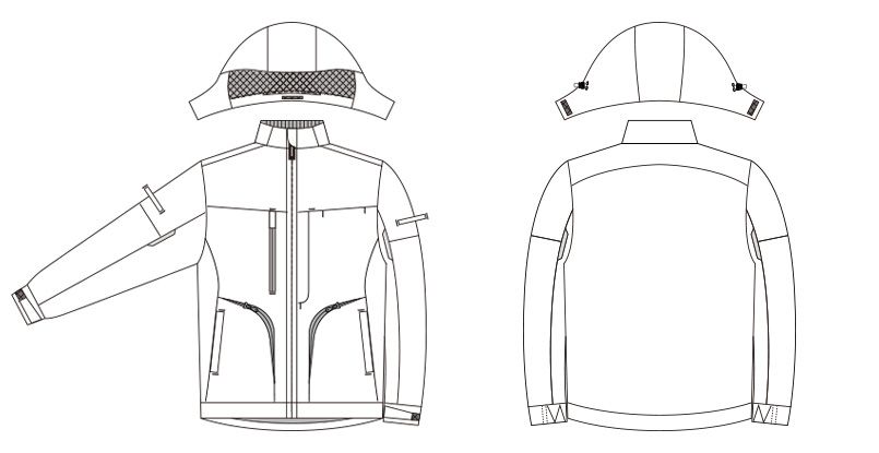 | 仕様 | 衿内側リブ、チンガード、フード絞り、隠しドットボタン、胸ポケット、両側袖ペン差し、胸ファスナーポケット、小物用ループ、隠し面ファスナー、長財布が入る大容量ポケット、反射パイピング、内ポケット、両脇ファスナーポケット、両脇逆玉ぶちポケット、袖口アジャストテープ、裾絞り、着脱式フード |