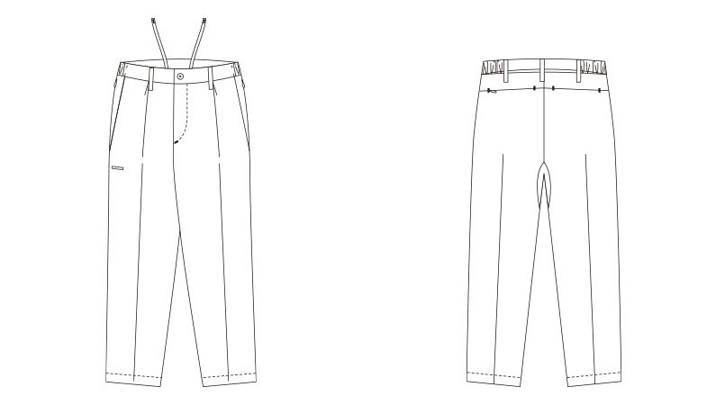 | 仕様 | ウエストサイドゴム仕様、糸付けボタン、内側ウエストアジャスター、両脇斜めポケット、両脇ファスナーポケット、サイドペン差し、裾紐通しホール、左後ファスナーポケット、股下マチ付き |