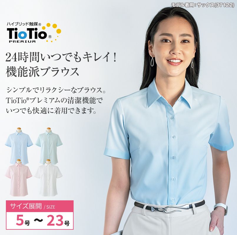 あたりまえの快適さを追求した、ニュースタンダードな快適ブラウスです。映え&クリーン&リラクシーを狙って抗菌・抗ウイルスに消臭、防汚、花粉脱落、洗濯耐久、帯電防止、安全性の8つの効果をもつ「TioTioプレミアム」の清潔加工を施したキレイめ4カラーでご用意しました。全身清潔コーデをかなえる共布マスクもご用意しています。TioTioプレミアム加工の同素材「制服美マスク」とのコーデで企業イメージもクラスアップです。