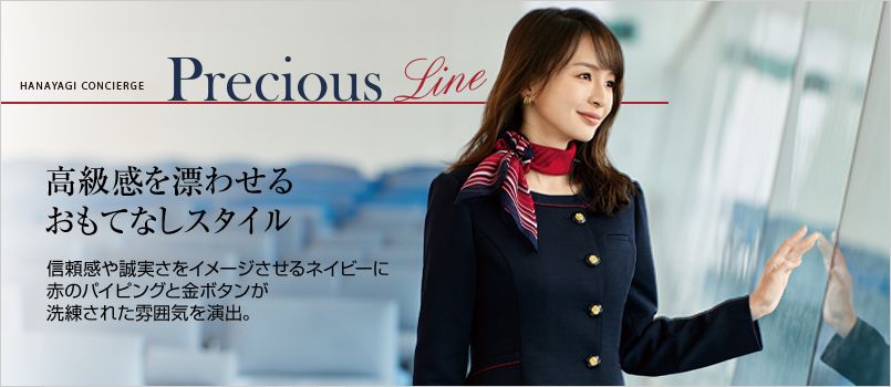 正面がボタン仕様のツイード素材のジャケット。華やかさがあり、幅広いおもてなしのシーンに品格を与えます。